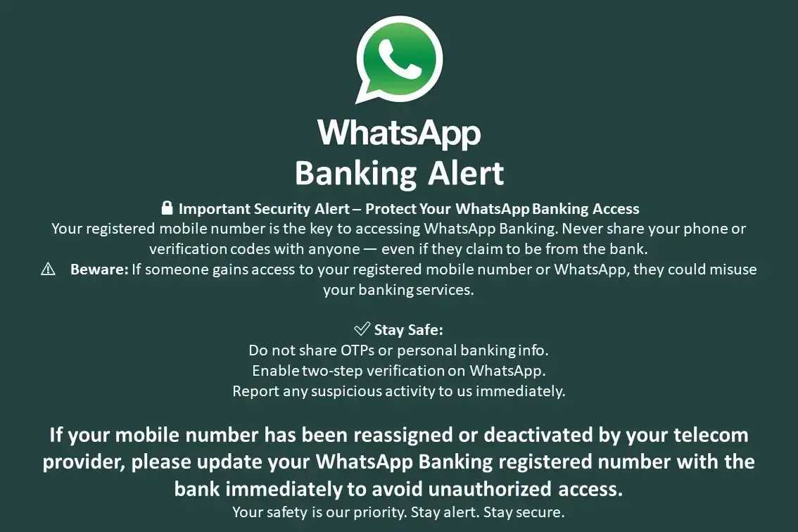Manage your account anytime, anywhere through WhatsApp. Check balance, get mini statements, and request cheque books.